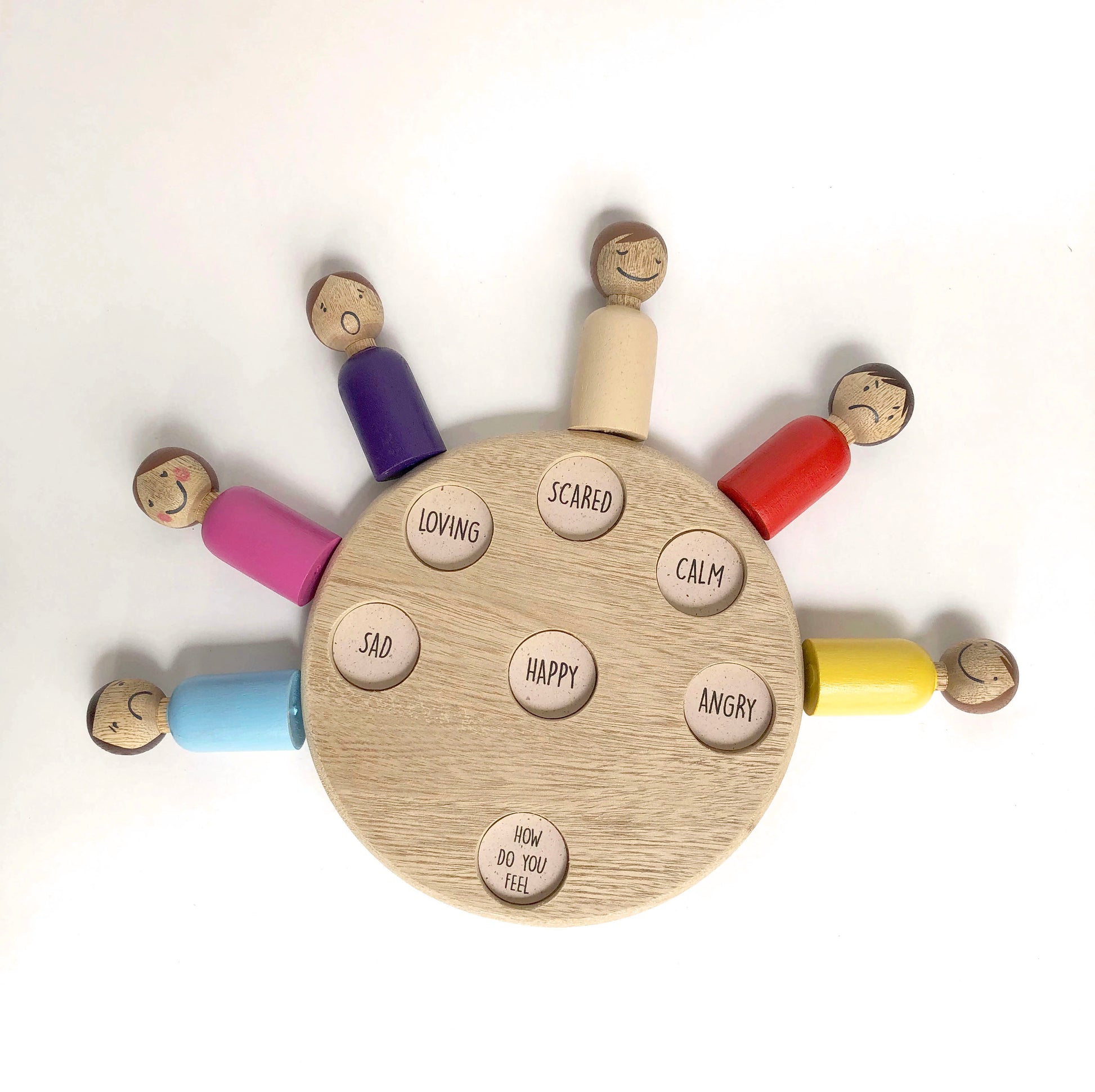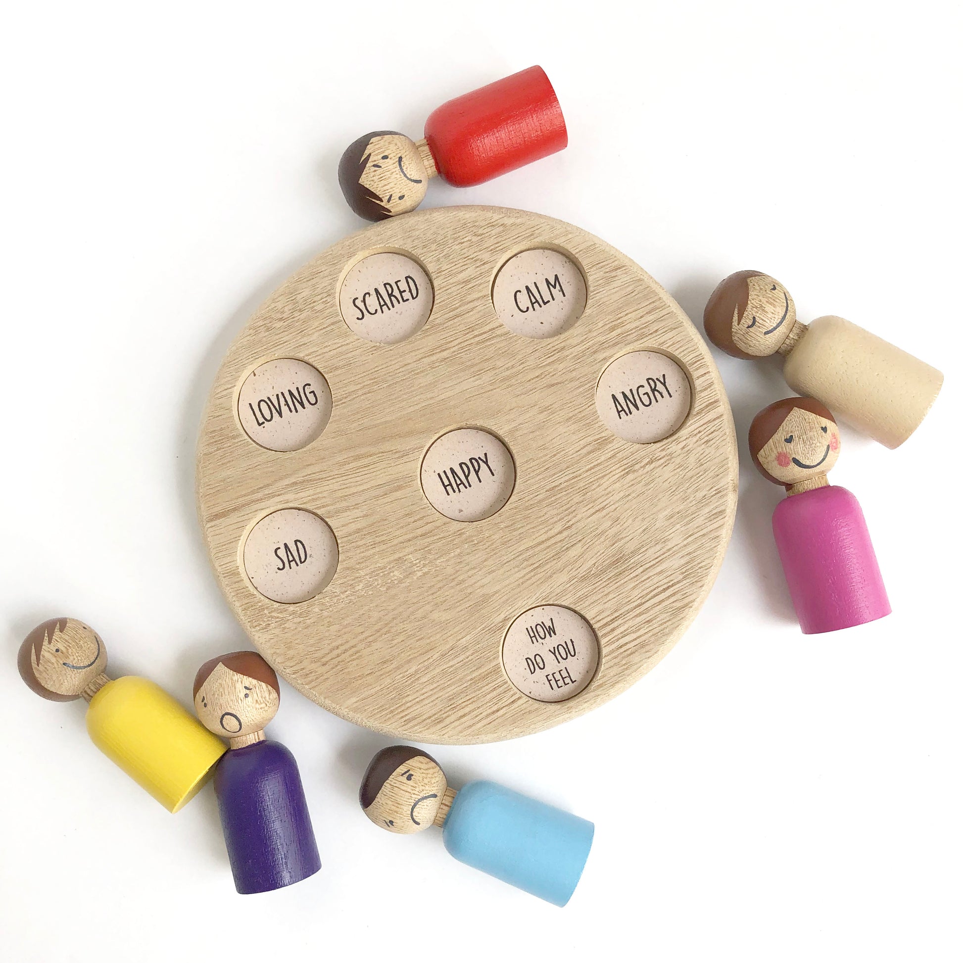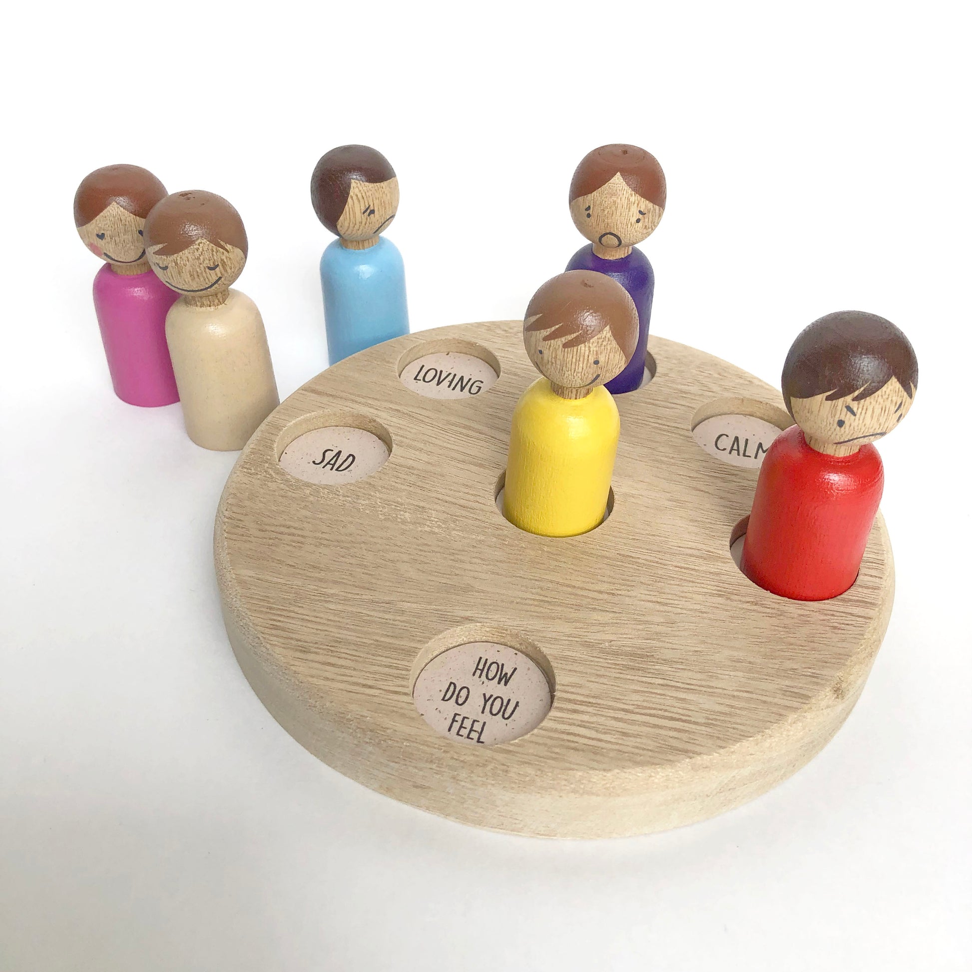 Each emotion is represented by a hand-painted wooden peg doll, using a color associated with the feeling and a facial expression that helps children understand each emotion more clearly.