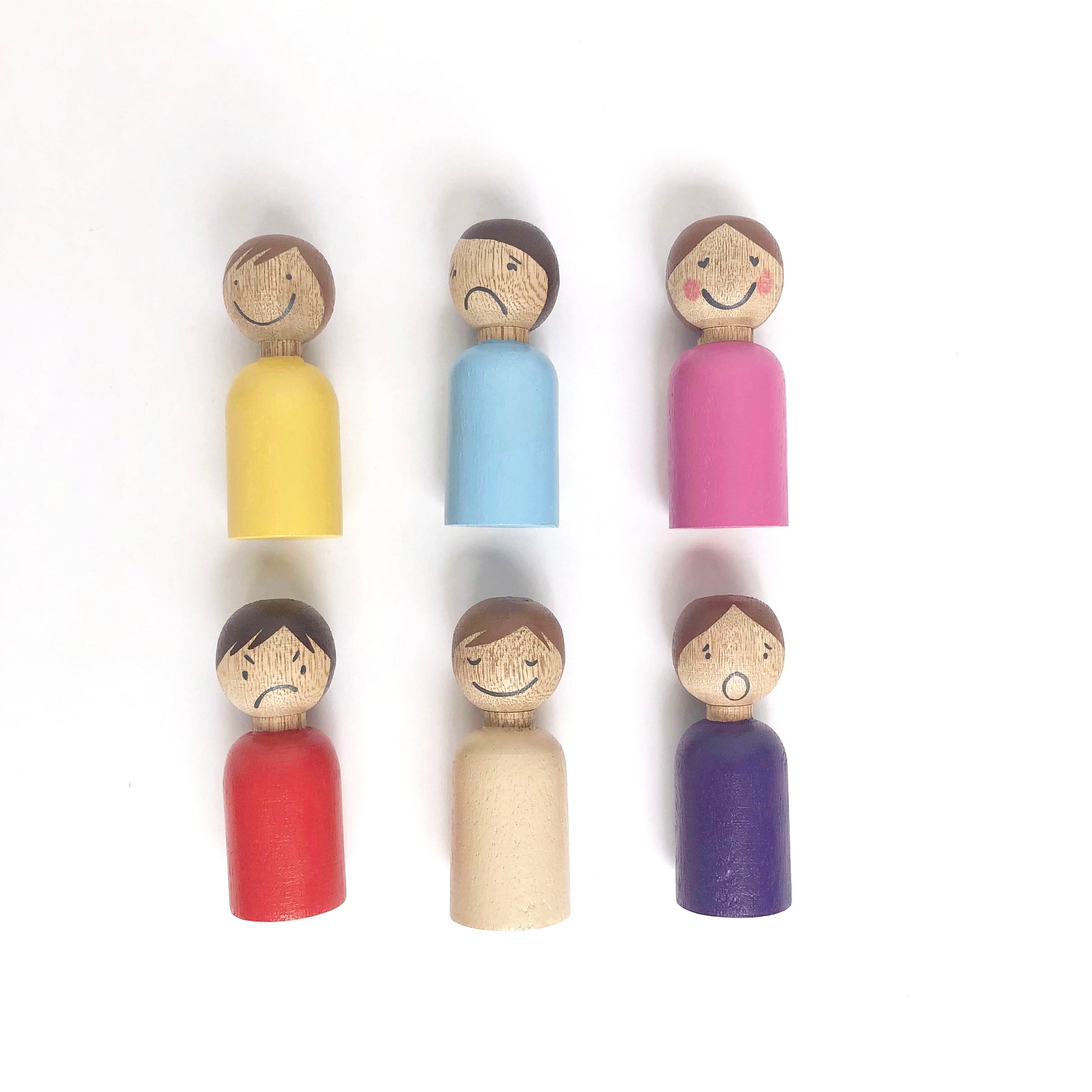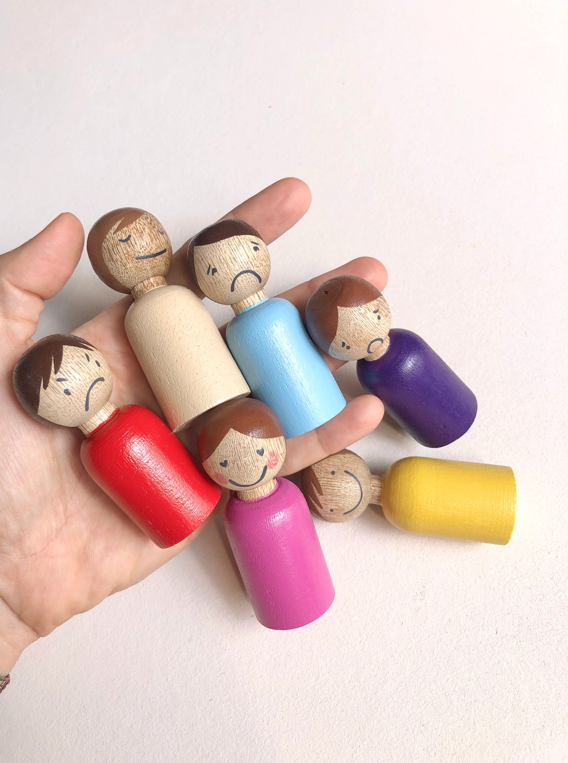 • 8 hand-painted wooden peg dolls with emotional expressions