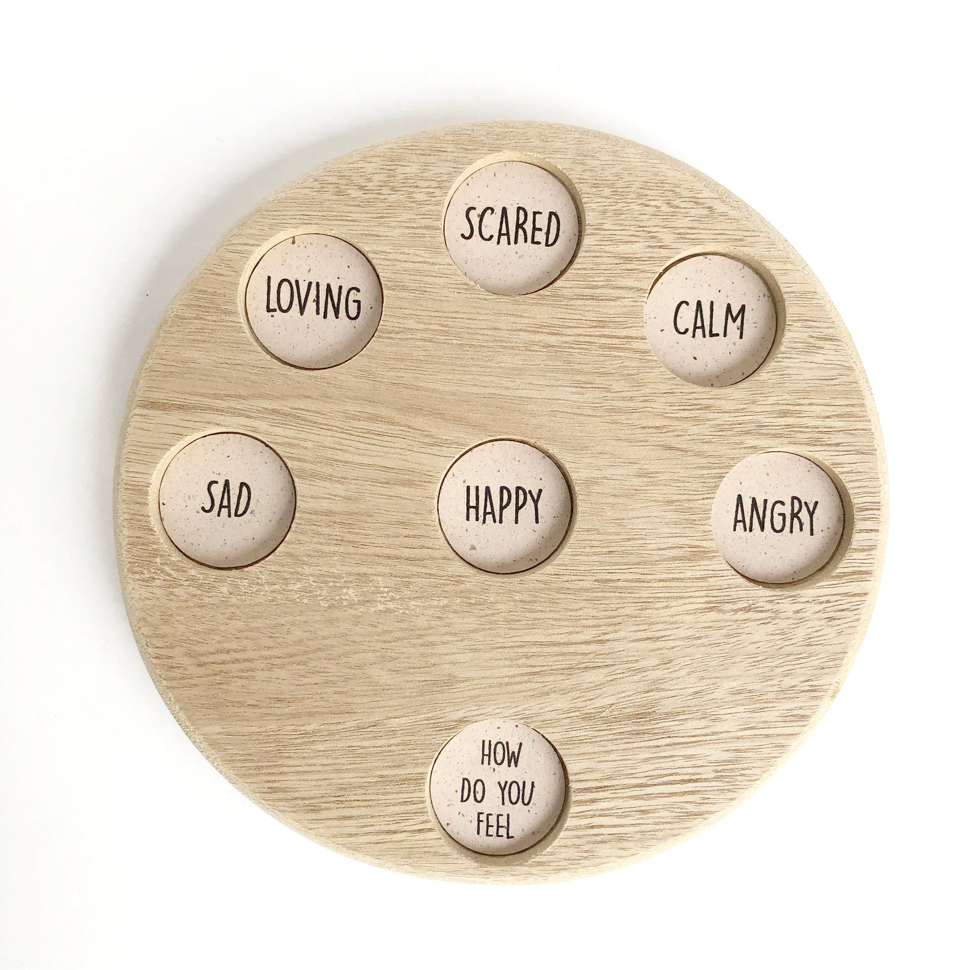 It includes a round wooden base engraved with 8 core emotions: