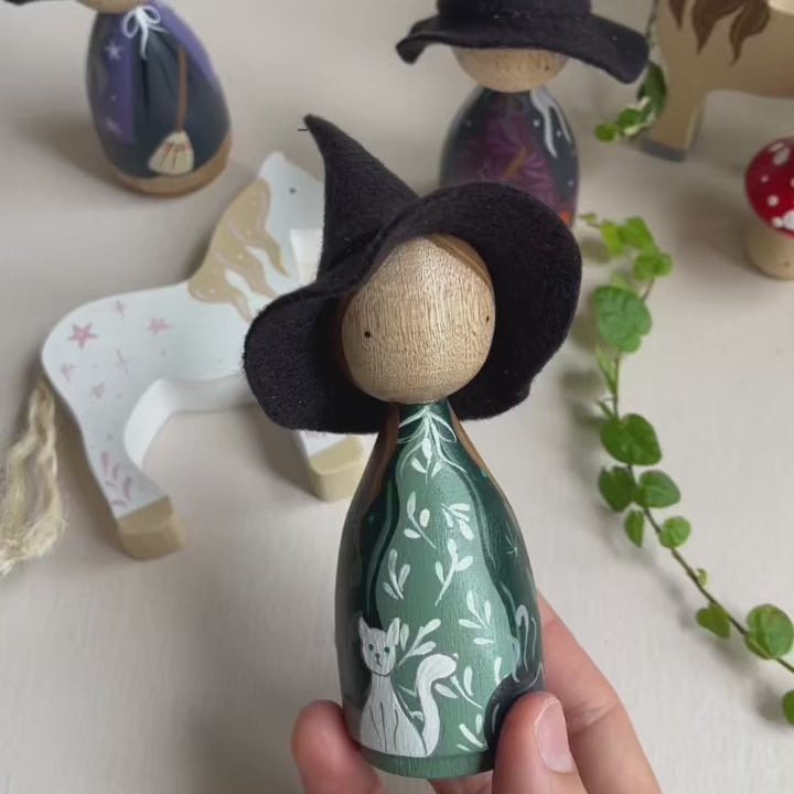 Bring a touch of magic into your home with this hand-painted wooden witch doll .