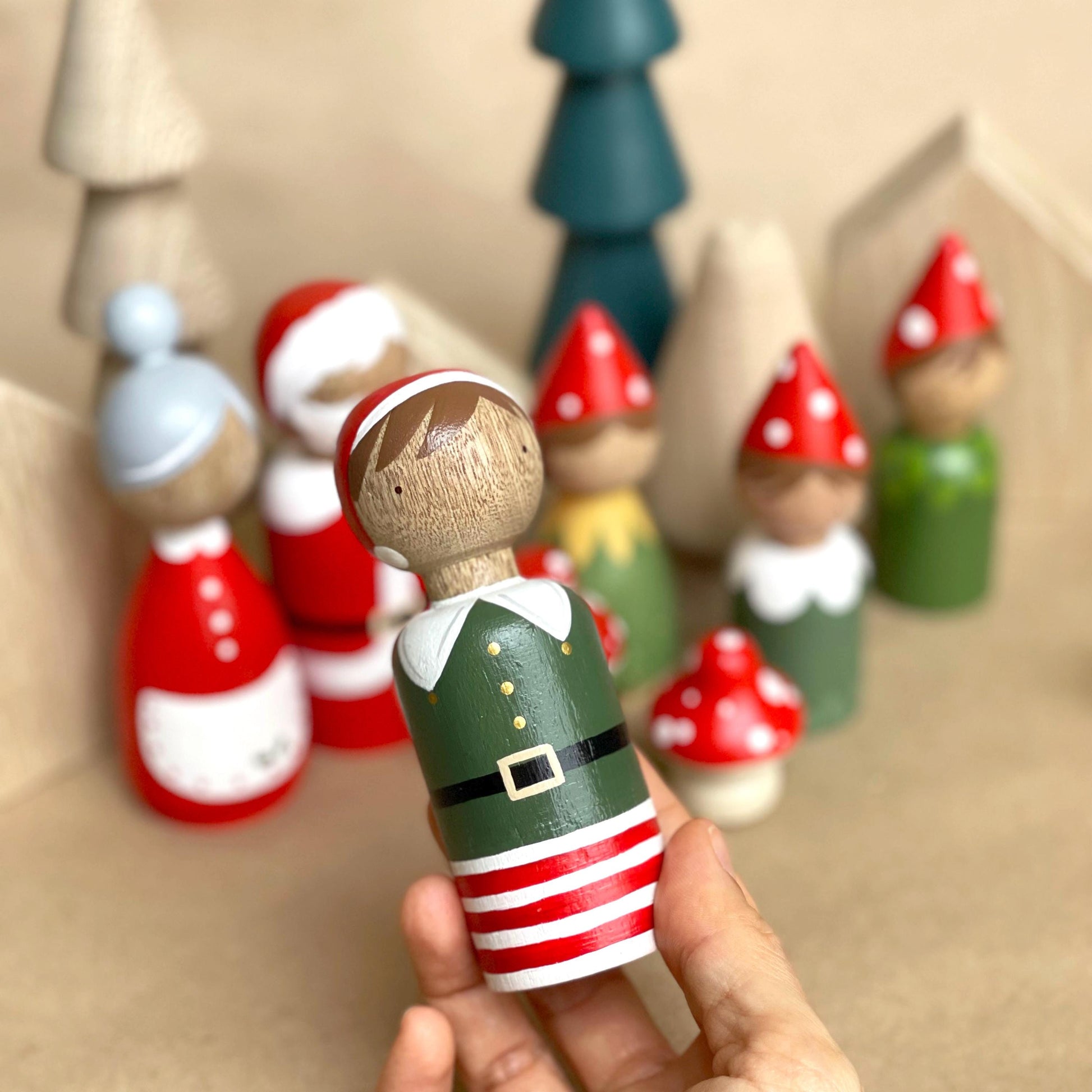 Bring holiday magic to your home with our christmas elf and santa Peg People! Handcrafted from quality wood, these advent figures are perfect as Christmas decorations or for joyful pretend play. Ideal for kids, Festive season decor, or a unique gift. Add a heartfelt touch to your holidays with these charming wooden treasures!
