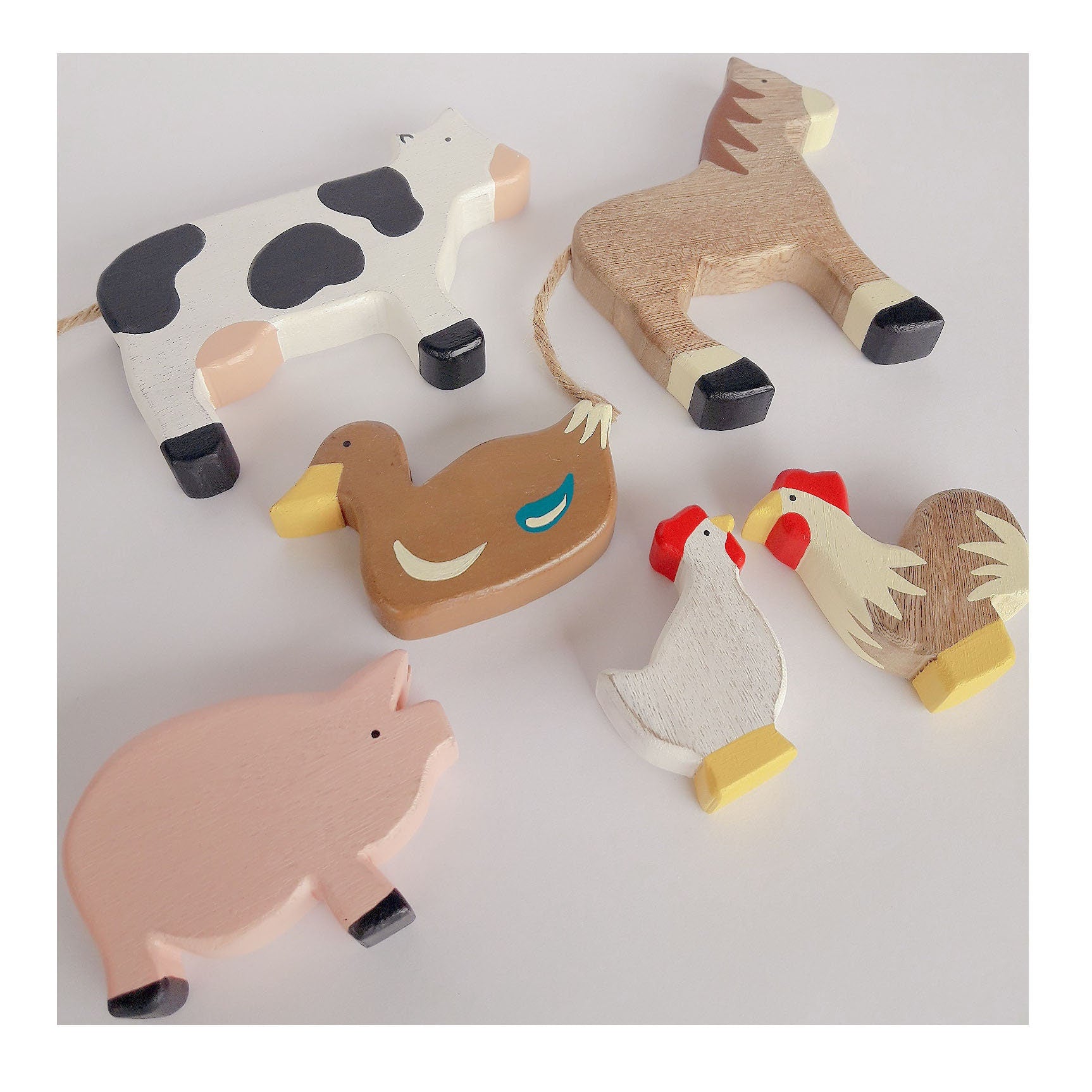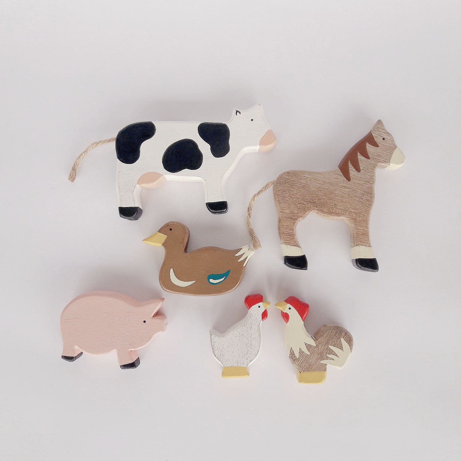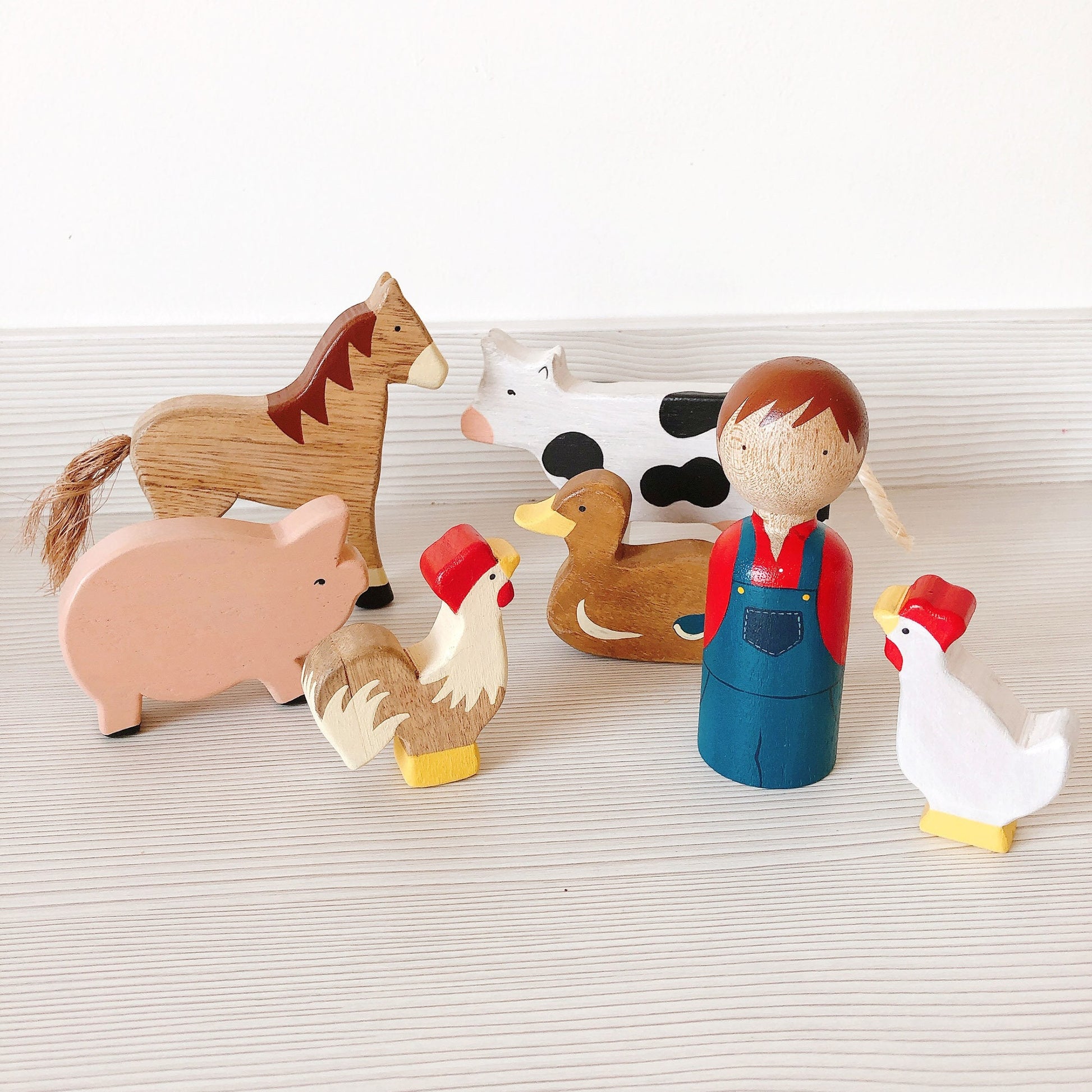 Wooden farm toy set includes 6 pieces, featuring a horse, a cow, a pig, a chicken, a rooster, a duck, and a farmer. Each of these adorable figures is meticulously handcrafted from wood and hand-painted with non-toxic colors.