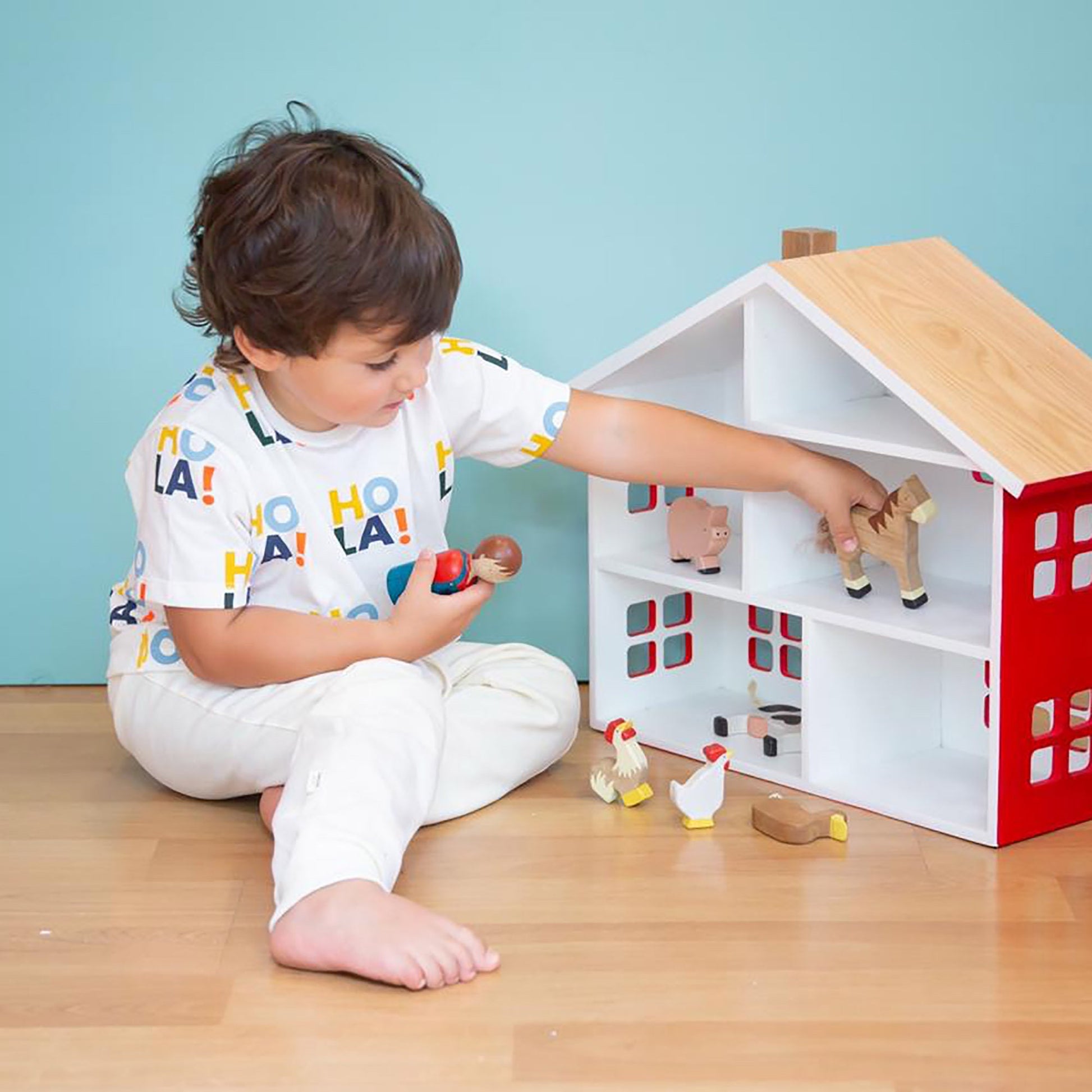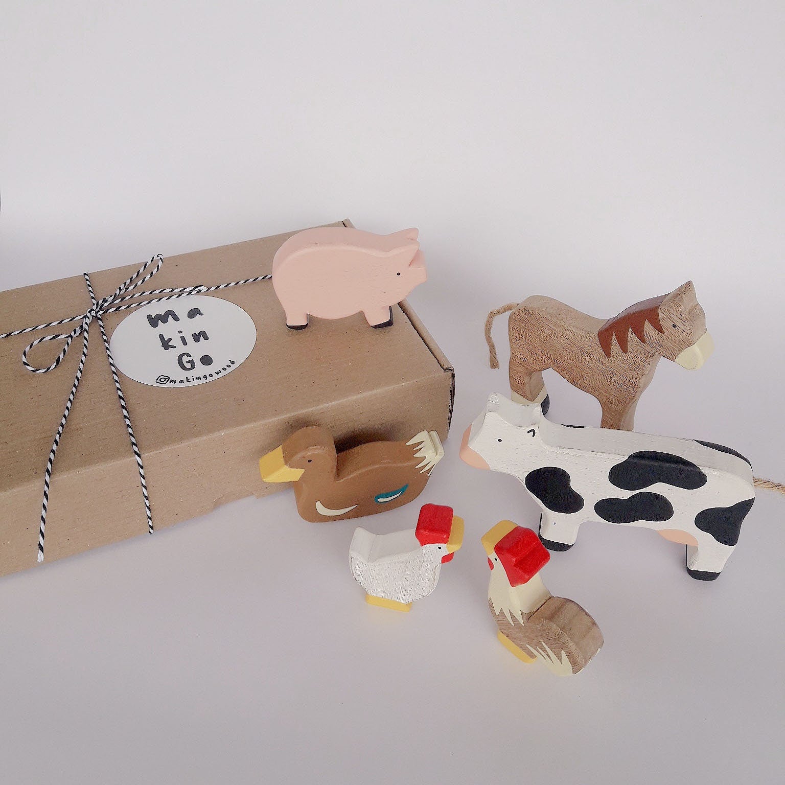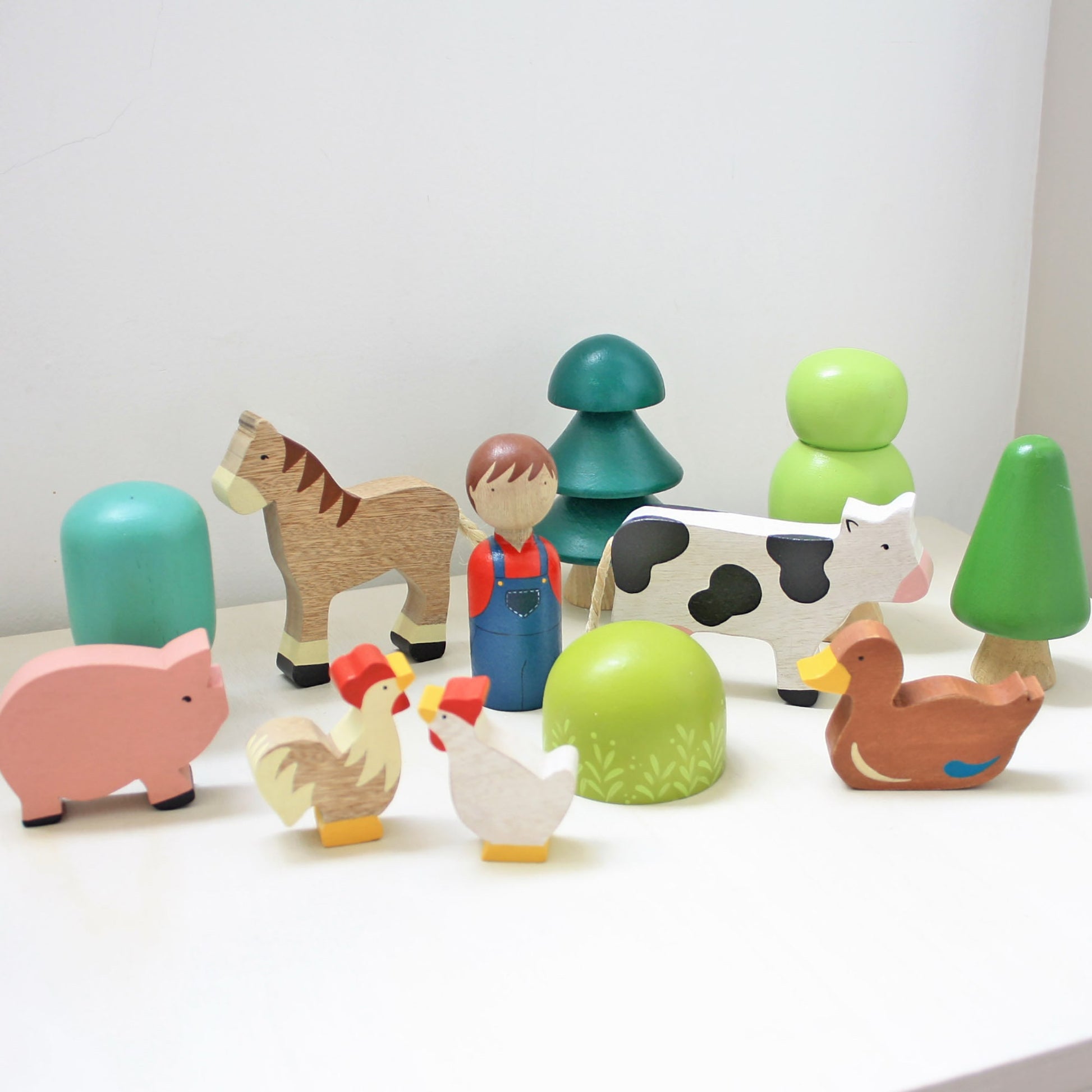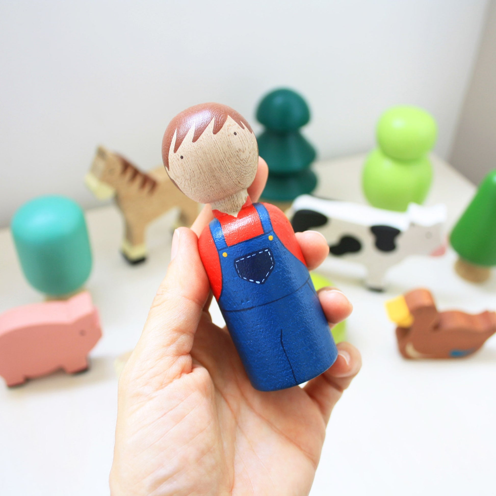 Wooden farm toy set includes 6 pieces, featuring a horse, a cow, a pig, a chicken, a rooster, a duck, and a farmer. Each of these adorable figures is meticulously handcrafted from wood and hand-painted with non-toxic colors.
