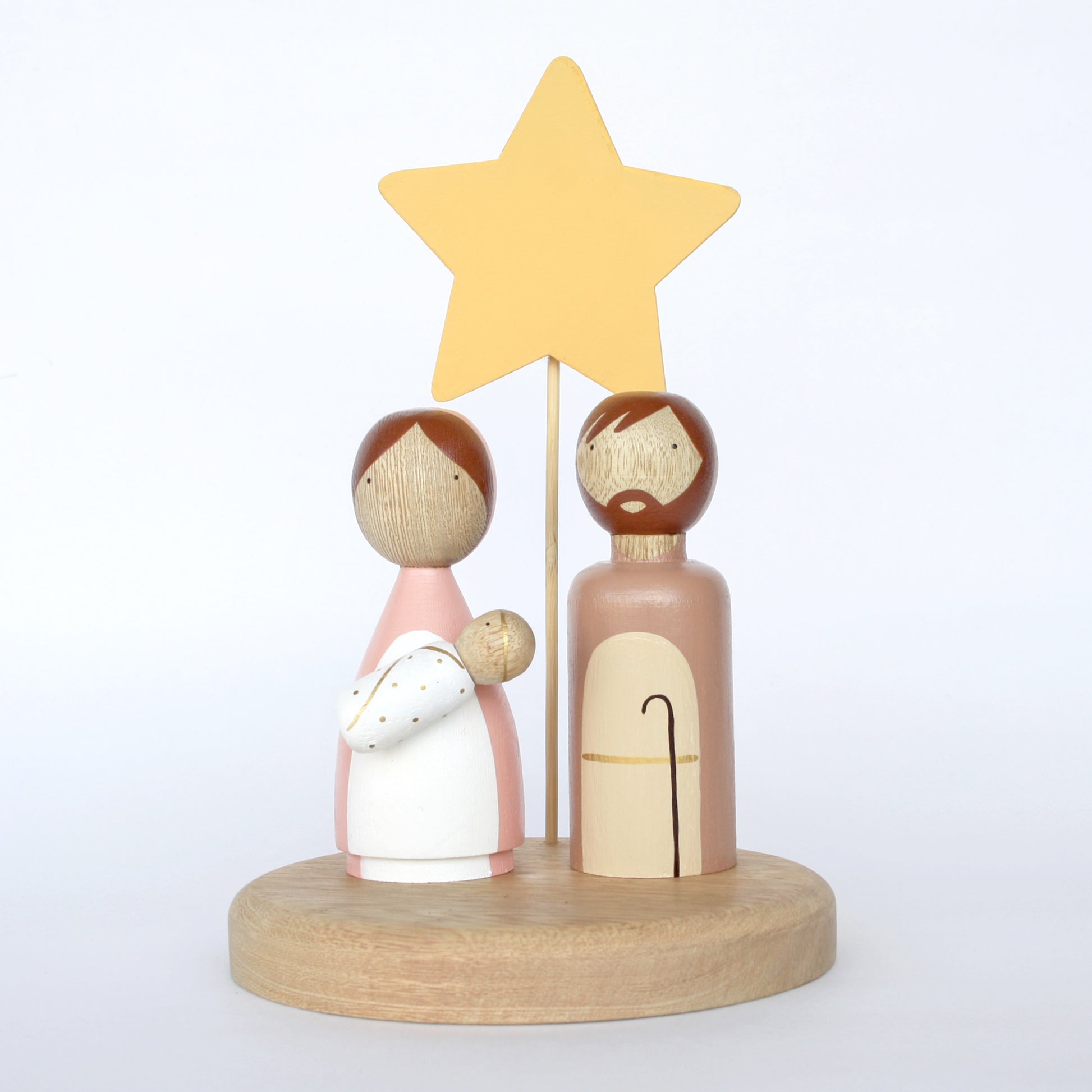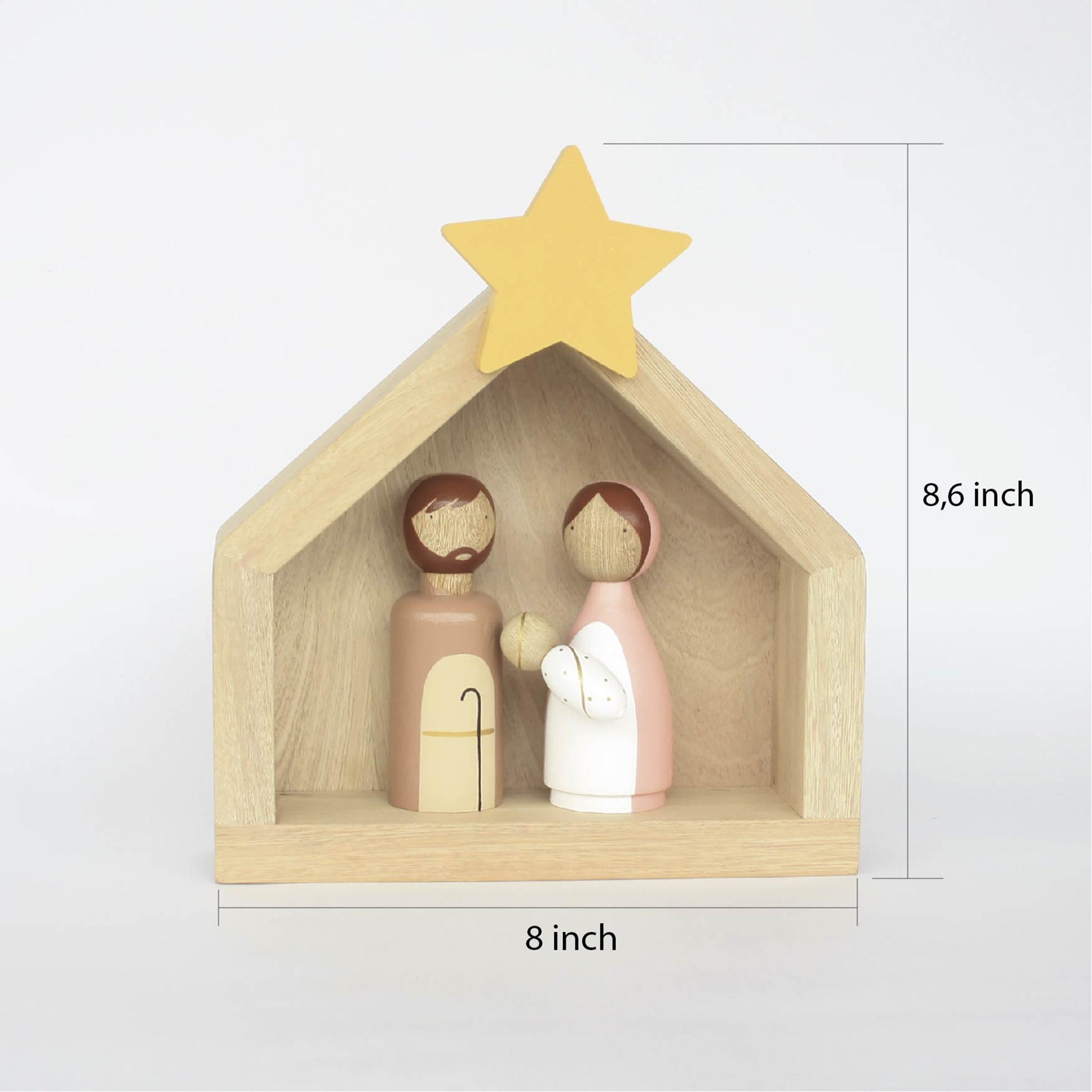 In the complete set you will receive a peg from Mary, Joseph, the little baby Jesus. on a wooden house with star, The set comes packed in a rigid cardboard box for safe storage. (5 pieces in total)
