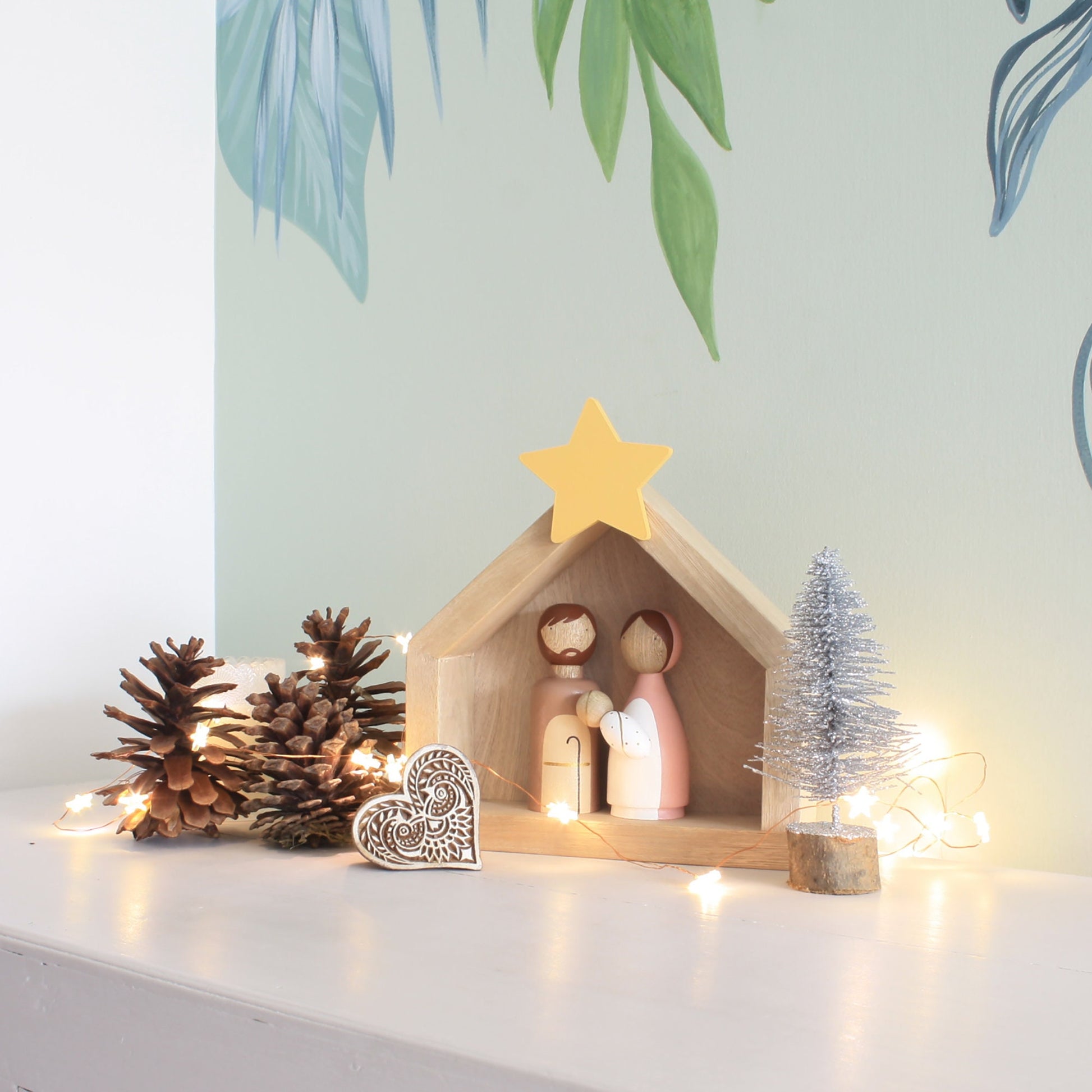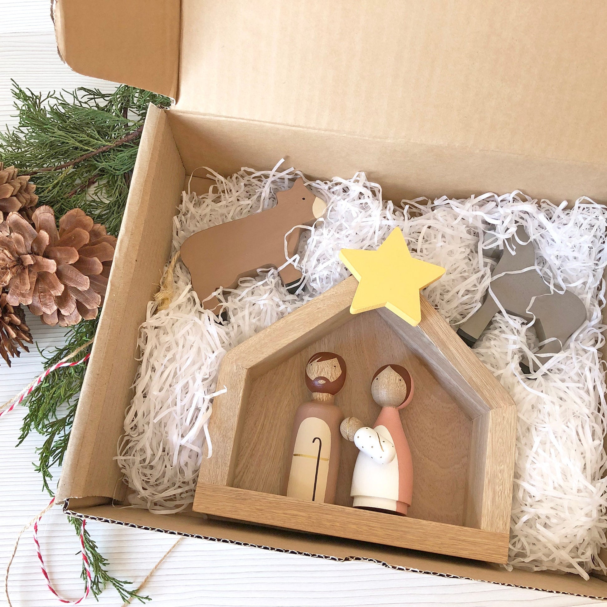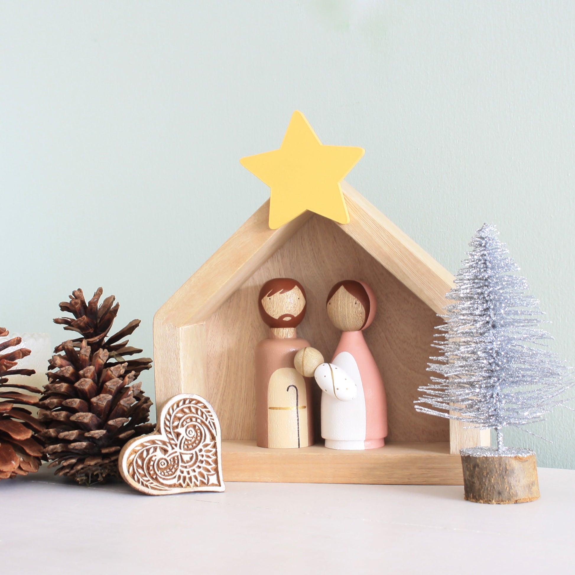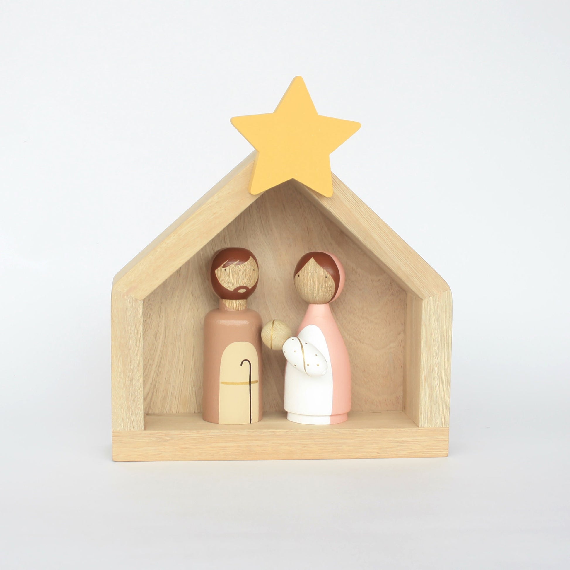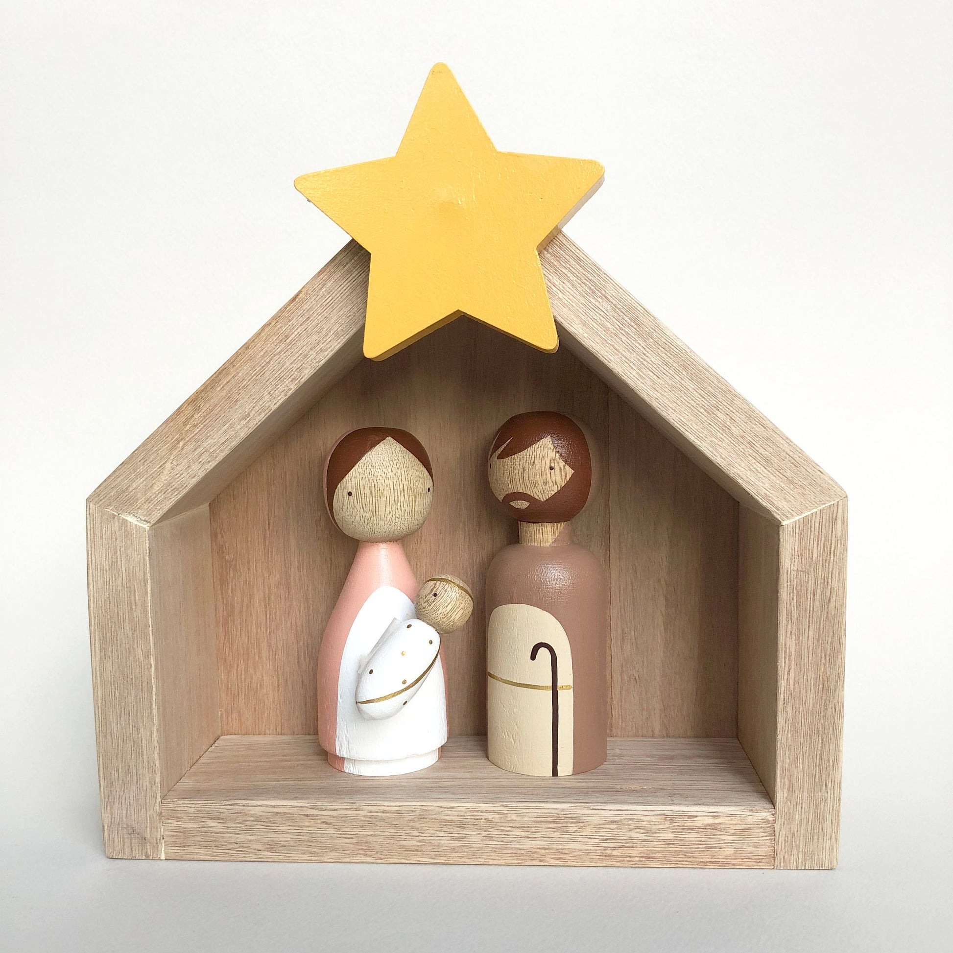 Wooden Kids Nativity Set - Peg Doll Christmas Story, Birth of Jesus Manger & Stable, Holiday Decorations, Holy Family